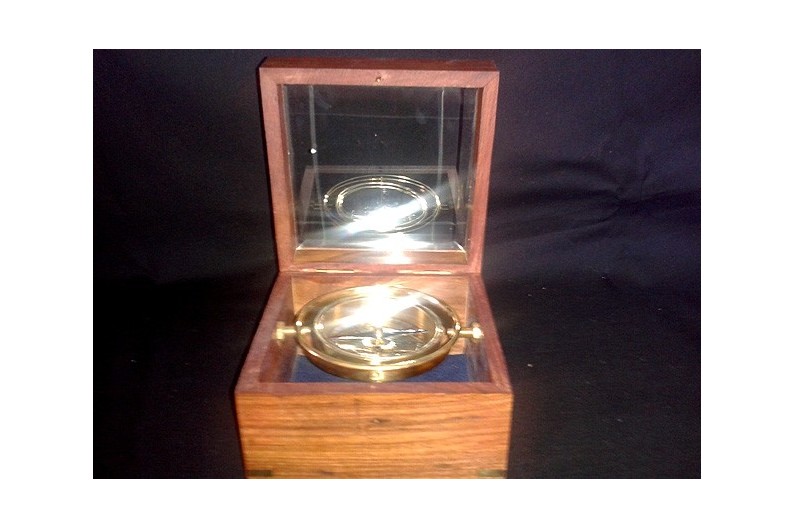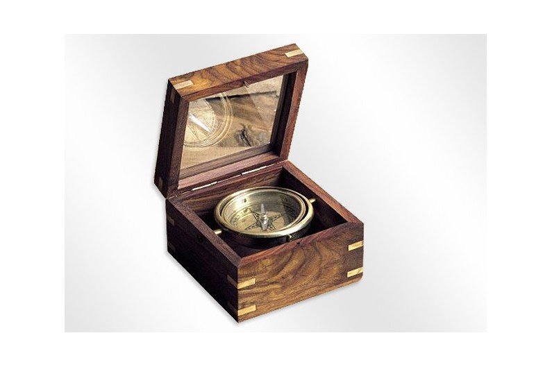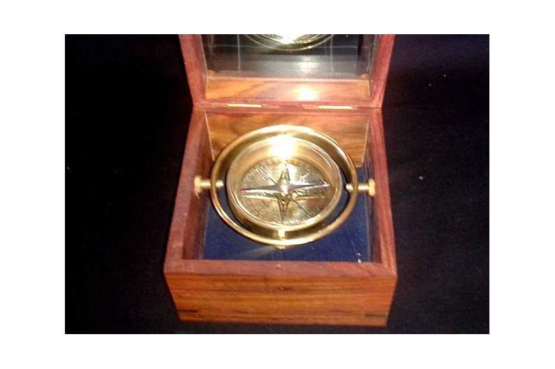 La paraula "brúixola" prové de l'italià "Bussola" (capseta). La brúixola va obrir el món de l'exploració i dels descobriments. Al segle III abans de JC, els xinesos ja utilitzaven el principi de l'agulla magnètica. Va ser utilitzada per primera vegada pels sacerdots Feng Shui, per tal d'indicar on i com construir. Els mariners xinesos l'adapten a la navegació, al voltant de l'any 1000, per tal de mantenir el rumb. La primera brúixola consistia en un recipient ple d'aigua en què surava una agulla magnètica suspesa d'un fil o enfilat a través d'una canya. Els àrabs la van perfeccionen muntant sobre un eix. Arriba a Europa entre els segles X i XI, permetent als navegants de travessar els oceans i als exploradors de descobrir els continents. El primer instrument que s'assembla al que hi ha actualment es deu al portuguès Ferrande (1483). Inspirada d'una brúixola del segle XIX. L'esfera és de llautó i la caixa en fusta de palissandre.