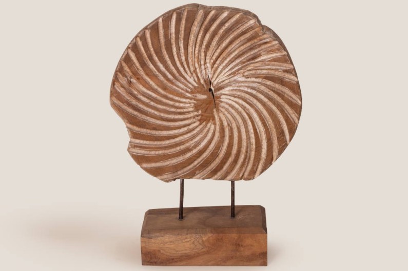 Panell rodó amb peu de fusta de teca, amb dibuix d´espiral per a decoració d´interiors. Fabricat artesanalment a Indonèsia, peça única.