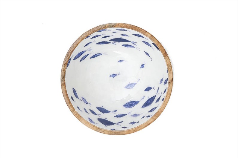 Bol fabricat en fusta esmaltades amb formes de peixos.