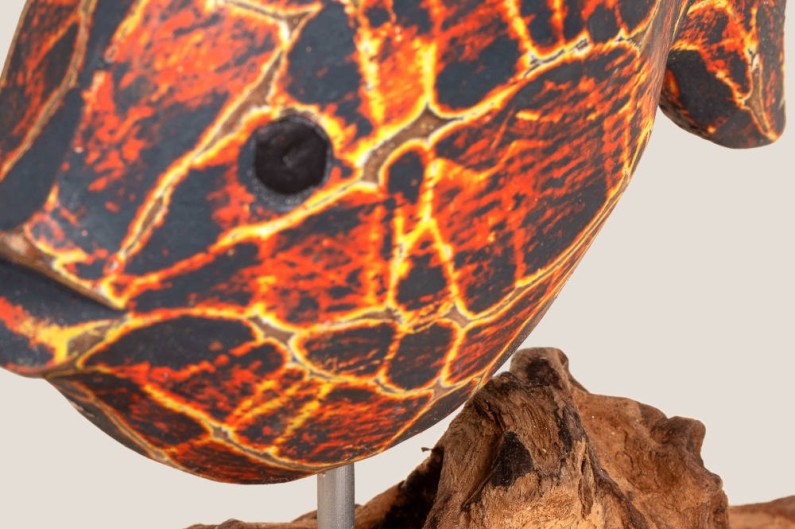 Peix vermell i marró fabricat amb duat d'Albàsia, amb peu de fusta rústica. Fet a mà a Indonèsia.