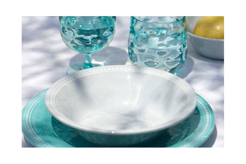Set de 24 peces, que inclou: 6 plats plans, 6 plats fondos, 6 plats de postres, 6 tasses mug i bossa de transport. Sèrie Acqua.