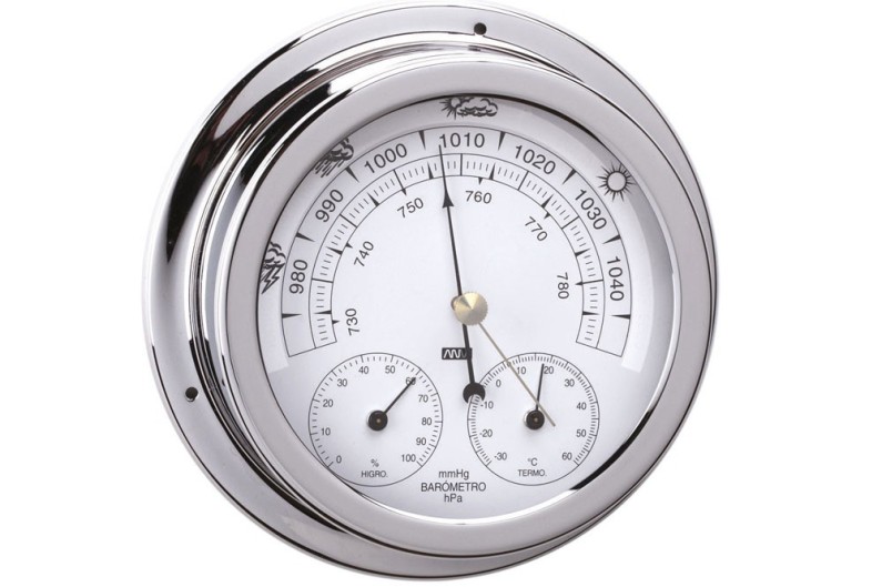 Petit instrument de mesurament real de temperatura, pressió i humitat. Fabricat amb llautó polit i lacat, de color platejat.