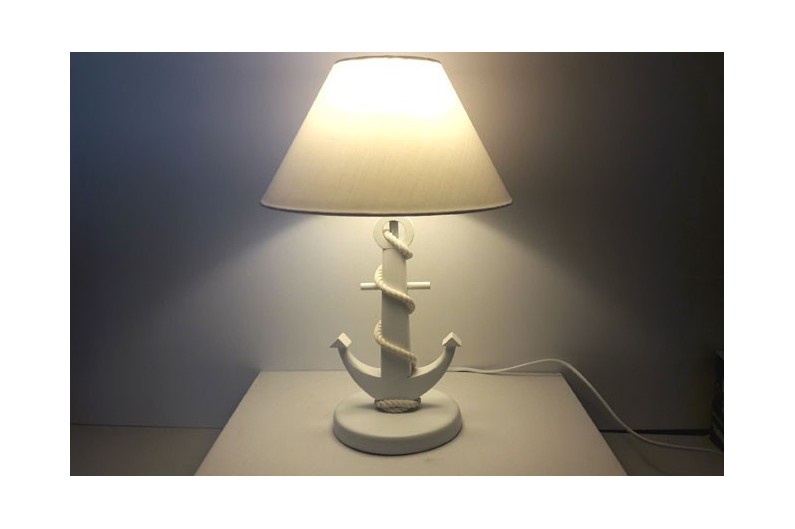 Llum original amb peu de àncora amb estil mariner. El peu d'àncora marina està fabricada en fusta de pi. La corda és de cotó.