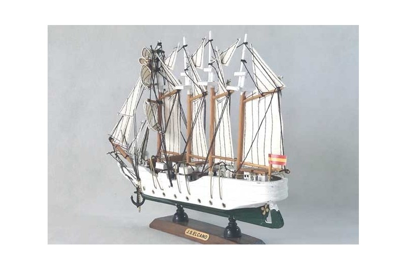 El projecte de construcció del vaixell neix amb un Reial decret de 17 d'abril de 1925, destinant per a això un pressupost de 7.569.794 pessetes i per tal de substituir al seu predecessor, el vaixell escola Minerva. Va prendre el nom de Joan Sebastià Elcano a record del il·lustre marí basc. La seva avarada va tenir lloc el 5 març 1927 sent la seva padrina Carmen Primo de Rivera, filla del president del govern. El 29 febrer 1928 realitza el seu viatge inaugural entre Cadis i Màlaga, portant un passatger d'excepció, el rei Alfons XIII. D'allí va partir per a Sevilla on se celebrava l'Exposició Universal, despertant l'admiració dels seus nombrosos visitants. El seu primer viatge transoceànic va ser la volta al món en direcció oposada a la ruta Magallanes-Elcano.