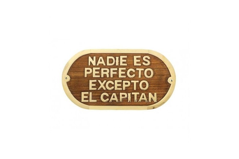 Placa de fusta i llautó amb la inscripció "NADIE ES PERFECTO EXCEPTO EL CAPITAN".