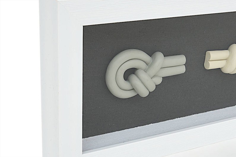 Preciós quadre mariner de nusos. Amb un fons de color negre i el marc de fusta pintat en blanc. Cadascun dels nusos està realitzat de forma sintètica.