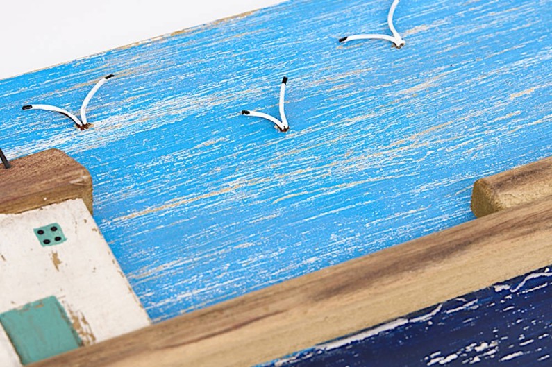Quadre marí decoratiu en fusta. S'hi destaca un bonic poble al costat d'un far mariner.