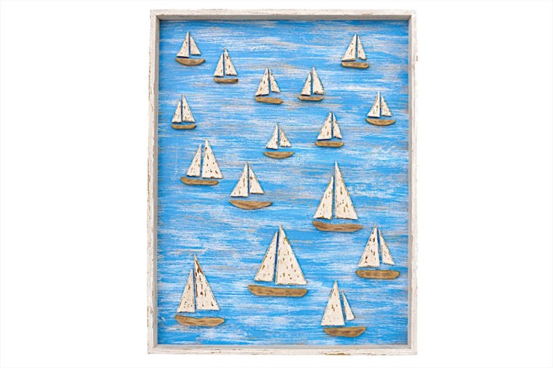 Quadre marí decoratiu en fusta. En ell es destaca un bonic vaixell mariner.