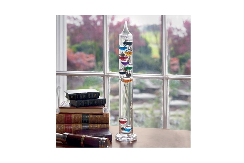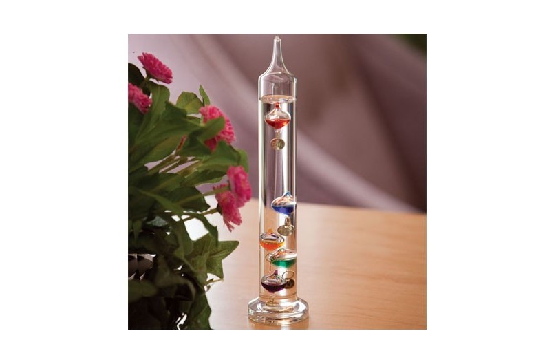 Basat en un termoscopi fabricat per Galileo Galilei a principis del s. XVII. Termòmetre bastant precís i molt senzill, actualment s’utilitza bàsicament com a decoració. El termòmetre Galileo consisteix en un tub de vidre segellat que s’omple d’aigua destil·lada i diverses bombolles flotants. Les bombolles es formen com esferes de vidre que s’omplen amb una barreja líquida de colors. Aquesta barreja líquida conté alcohol, o pot ser simplement aigua amb colorants alimentaris.