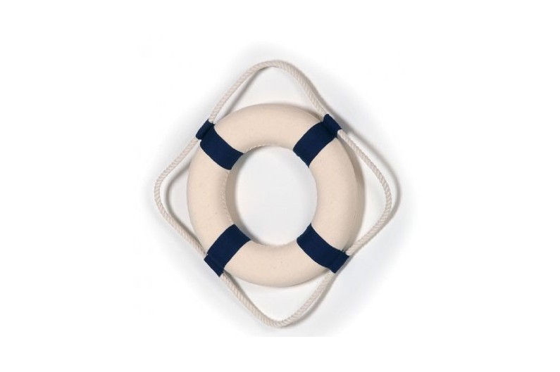 Rèplica exacta d'un salvavides, ideal per donar un toc marí a la decoració. Realitzat en porexpan al seu interior i recobert d'una lona de cotó. La corda de cotó lligada al seu voltant s'utilitza per poder agafar-se.