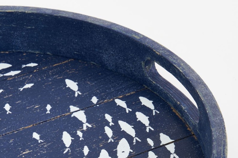 Safata de fusta rodona pintada de color blau, simulant vell o antic.