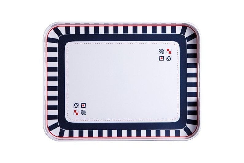 Safata rectangular, de preciós disseny, de fons blanc i ratlles blaves y vermelles.
