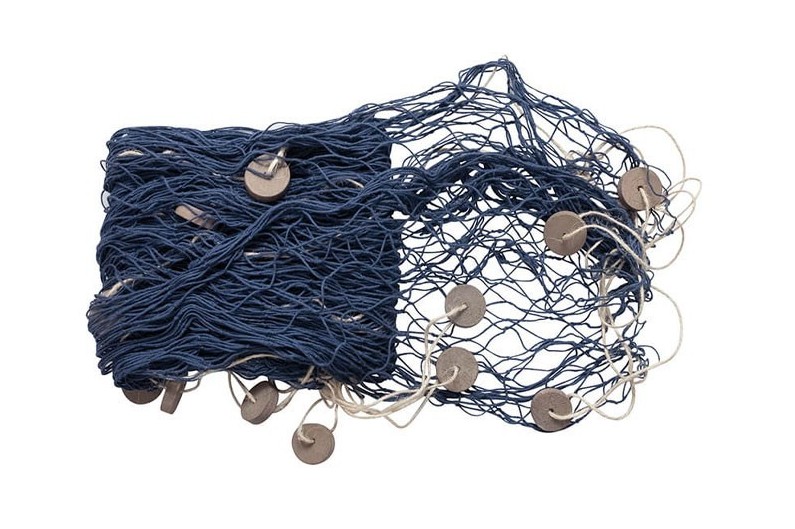 Xarxa de pescador en cotó. Els flotadors estan units a cada extrem per una corda de cànem. Objecte decoratiu que donarà un ambient marí.
