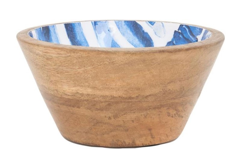 Schüssel aus emailliertem Holz mit aufgedrucktem blauem Bild.