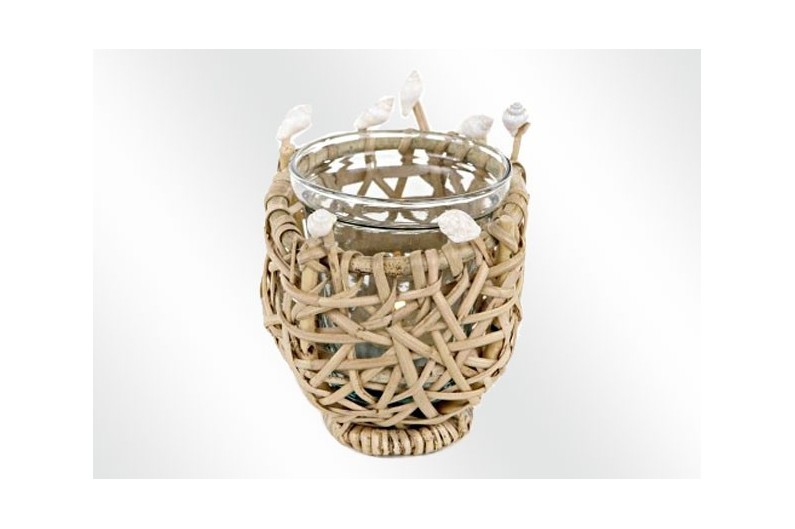 See-Kerzenleuchter zum Aufhängen mit Glasbecher . Hergestellt aus Korbgeflecht und natürlichen Muscheln. Handwerkliche Herstellung.