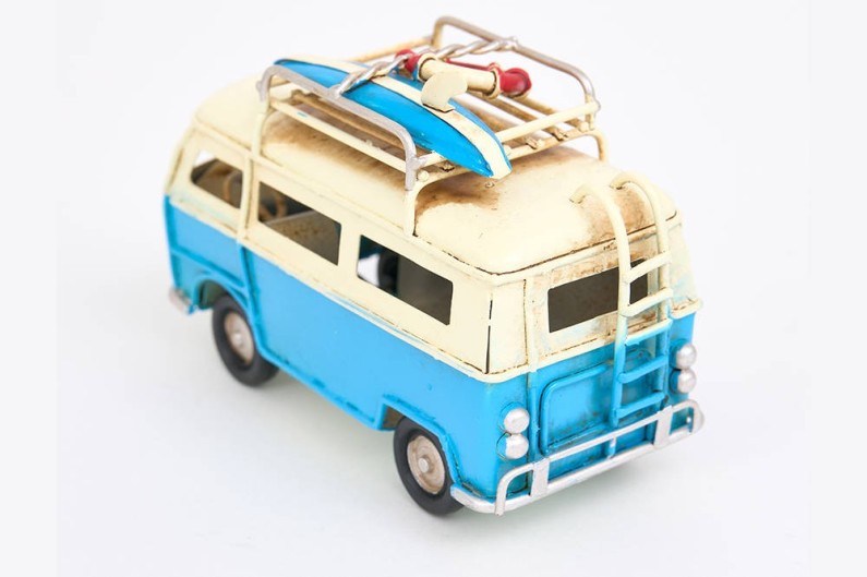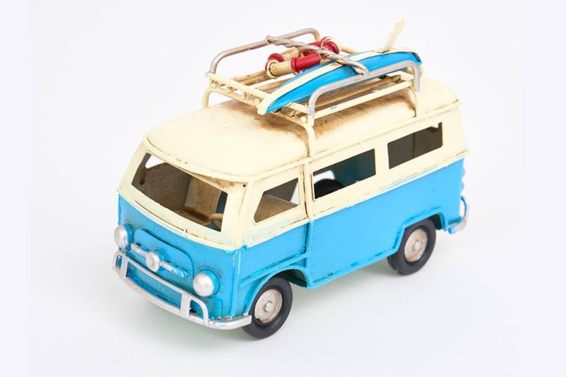 Schönes Modell eines alten Lieferwagens aus den 70er Jahren, ein typischer Lieferwagen vom Typ „Volkswagen“, mit Surfbrett, bereit für die Fahrt zum Strand.