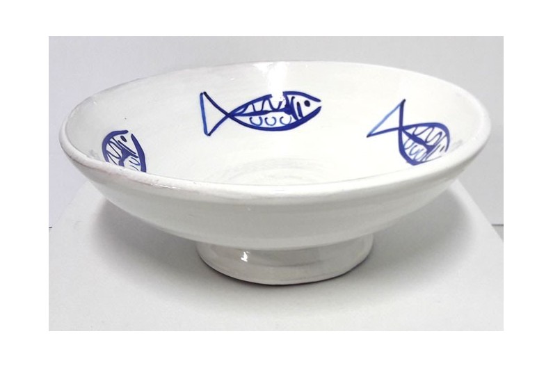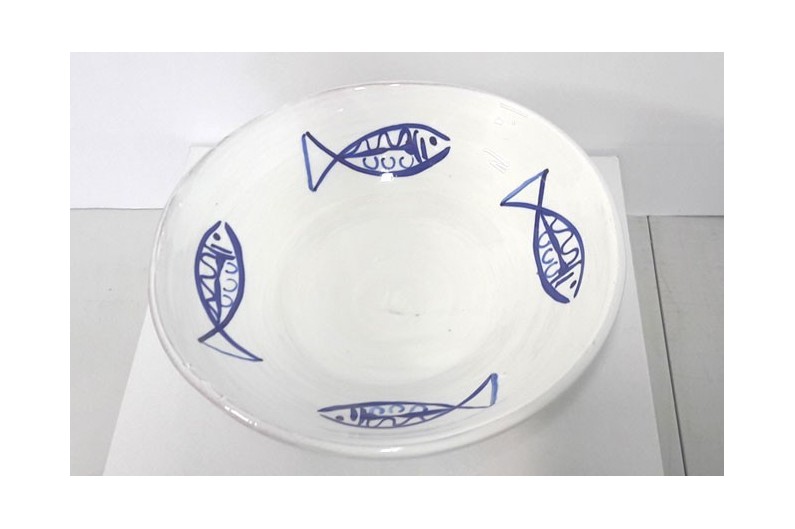 Tray made of non-porous ceramic with blue fish print. Ideal for offering large meals on the table. Dishwasher resistant.