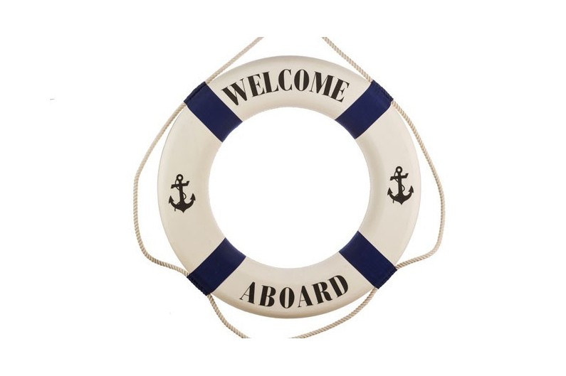Rettungsring "Bienvenue a Bord" - "Welcome on board" umkehrbar. Exakte Nachbildung eines Rettungrings, ideal um Ihrer Einrichtung enen See-Touch zu geben. Innen aus Porexpan gemacht und mit einem Baumwollsegeltuch bedeckt. Das Seil rundherum benutzt man, um sich zu halten.