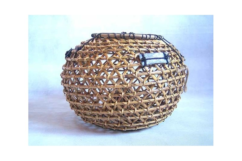 Geflechter Fischkorb in mit Trichterform-Rüstung , in dem Köder gelegt werden, um Fische zu fangen, vor allem nah der Küste. See-Objekt, das eine Urlaubsatmosphäre in Ihrer Wohnung schafft.