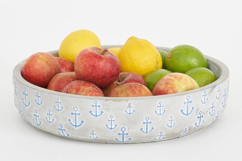 Zementschale mit eingravierten Ankern. Ideal, um Obst in der Mitte des Tisches zu platzieren.