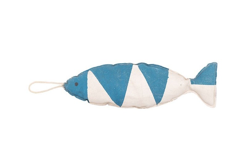 Kissenhülle + Füllung fischförmig, hohe Qualität, beiger Hintergrund, Blau und weiß farben.