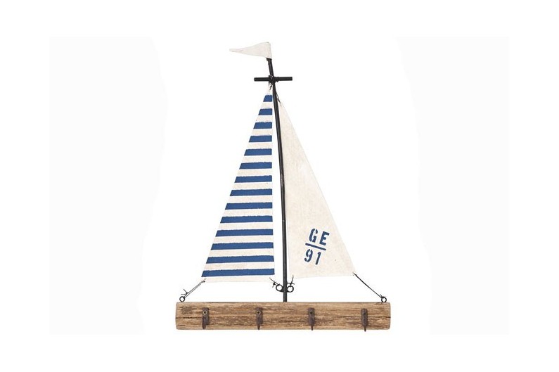 Schlüsselanhänger in Form eines Segelboots, handgefertigt aus Holz, Stahl und mit einem Baumwollsegel.