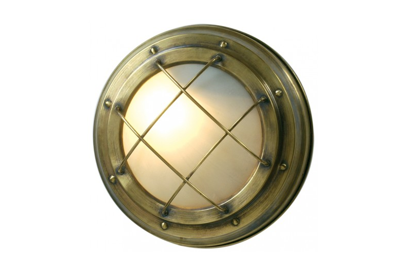 Elektrische Wandlampe (Bullaugen-Lampe) inspiriert in den Lichtern von Handelsschiffen, um Gänge und Kabinen zu beleuchten. Hergestellt aus veraltetem Messing und geschliffenen Glas, mit Gitterschutz fixiert mit Flügelmuttern . Einsatz im Freien wird nicht empfohlen.