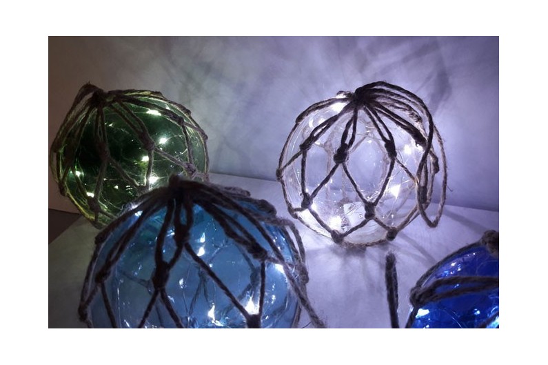 Set mit 4 Fischerbojen mit LED in verschiedenen Farben. Die Fischer-Boje war ein alter Schwimmer bestehend aus einer Glaskugel in einem geflochtenen Seil gewickelt. Diese Schwimmer wurden bis in die 50er Jahre verwendet . Sie wurden an die Fischernetze festgemacht damit sie an der Oberfläche blieben während sie vom Strom getrieben wurden. Ein Objekt, das ein dekorativer Meeres-Touch gibt.