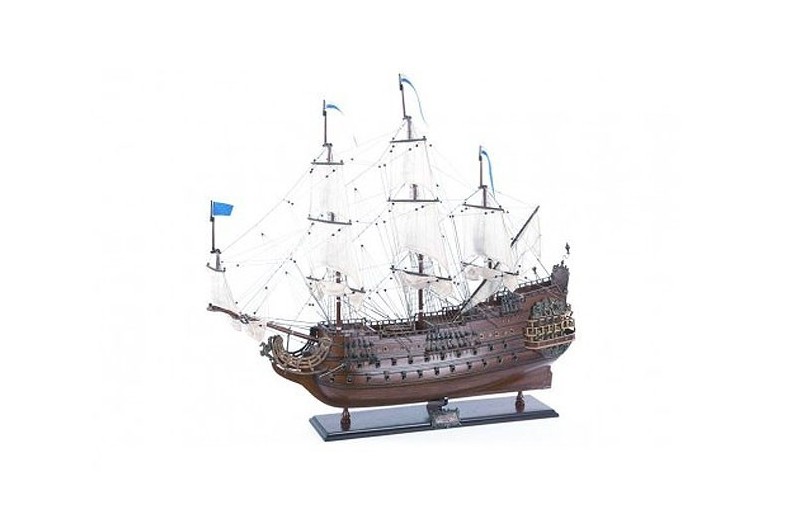 Dekoratives Modell mit hochwertiger Bearbeitung aus lackiertem Holz, ompletthand montiert.Verpackung in einer Einzelkiste. Das Soleil Royal (1669), französisches Kriegsschiff , in den Werften von Brest gebaut, ist ein Schiff mit 80 Kanonen.