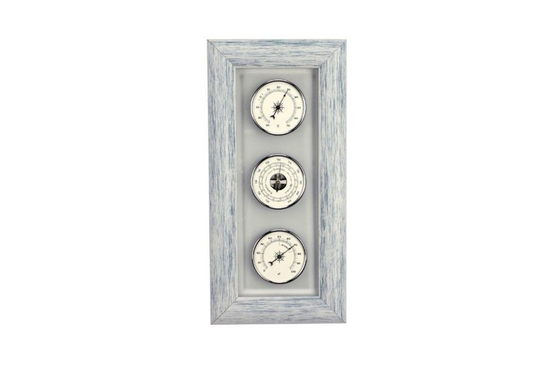 Wetterstation. Informiert über Feuchtigkeit, Luftdruck und Temperatur. Kann eine einfache Wettervorsage für jeden Seemann hergeben. Sie ist auf einem Holzrahmen befestigt.