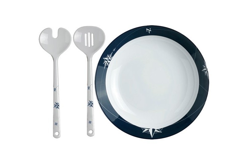 Salatschüssel mit Besteck, wunderschönes Design, mit weißen und blauen Hintergrund.