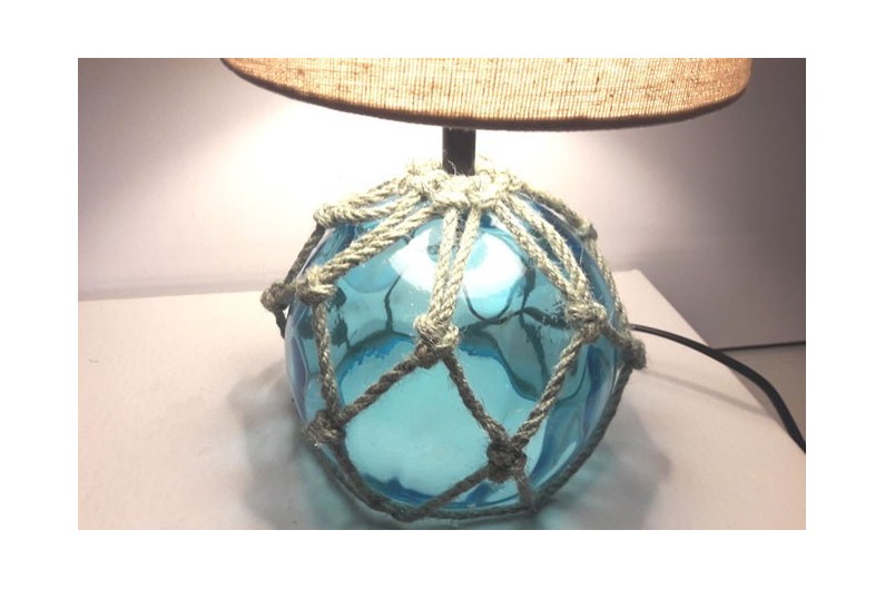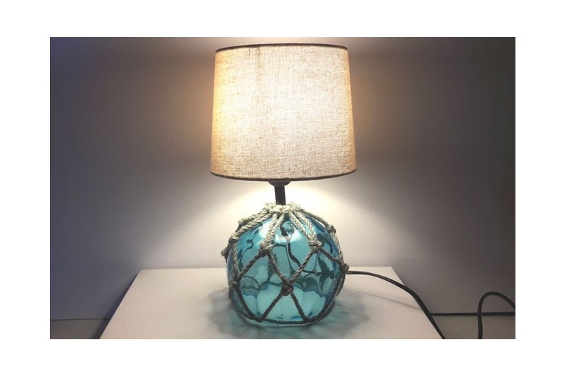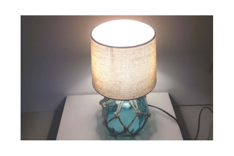 Tischleuchte aus Glasbojen mit Lampenschirm aus durchscheinend Stoff.