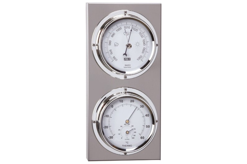 Wetterstation. Informiert über Feuchtigkeit, Luftdruck und Temperatur. Kann eine einfache Wettervorsage für jeden Seemann hergeben. Sie ist auf einem Edelstahlrahmen montiert. Für den Außenbereich geeignet.