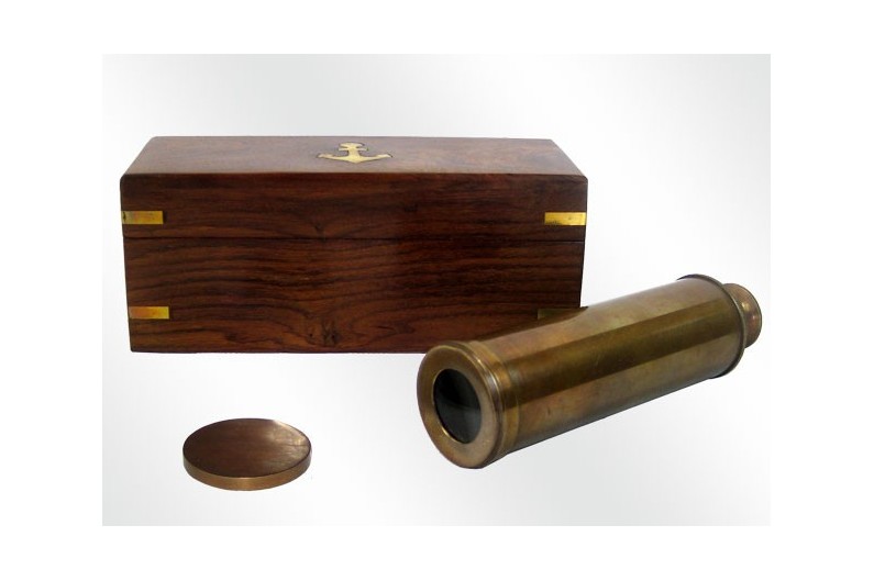 Beautiful replica of an old spyglass, made of bronze, with special treatment. Includes wooden box lined inside with inscribed anchor. Once extended the spyglass has a length of 38 cm. It works perfectly but its use must be exclusively decorative.