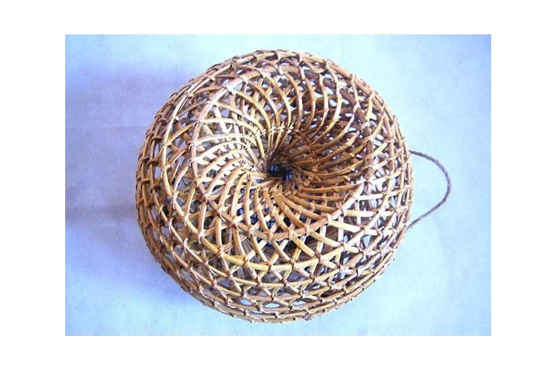 Braided wicker fish trap. Inverted funnel shaped interior for placing bait, particularly for rock fish. For that holiday feeling indoors.