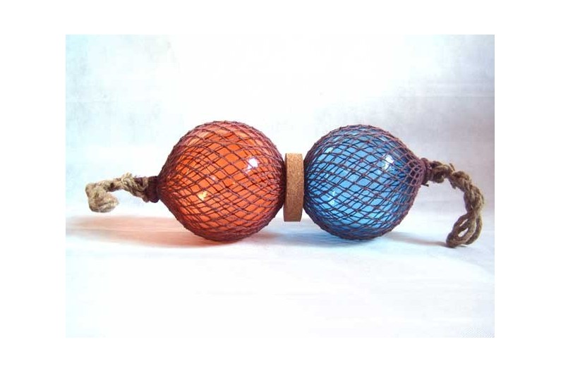 Two-piece fishing float in blue and orange. Glass balls in braided hemp net. Until the 1950s fishermen attached these to their nets to keep them afloat while they drifted with the current. Lends a decorative marine touch.