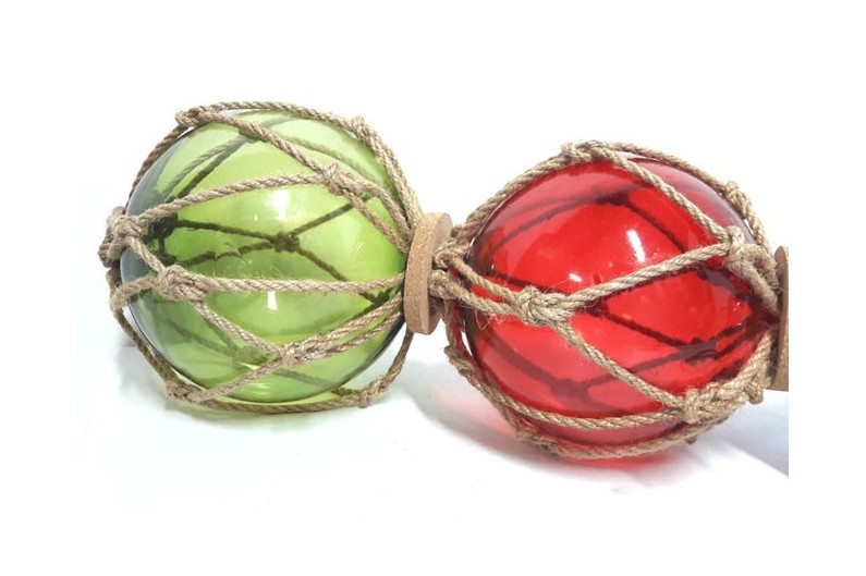 Three-piece fishing float in blue, red and green. Glass balls in braided hemp net. Until the 1950s fishermen attached these to their nets to keep them afloat while they drifted with the current. Lends a decorative marine touch.