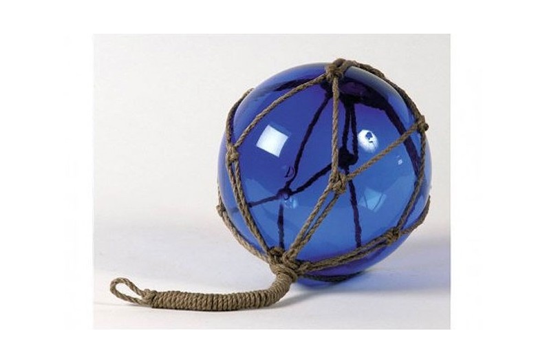 Red fishing float. Glass ball in braided hemp net. Until the 1950s fishermen attached these to their nets to keep them afloat while they drifted with the current. Lends a decorative marine touch.