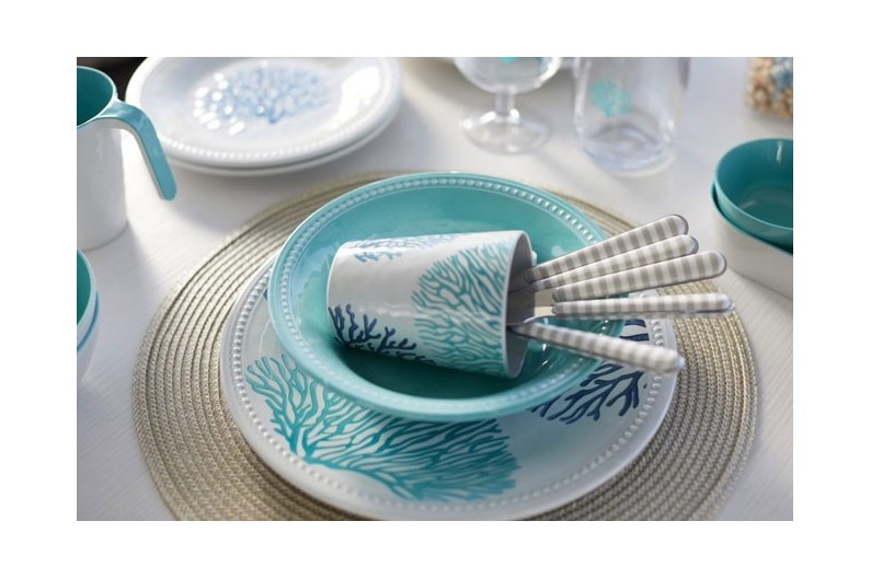 Set of 16 pieces, including: 4 flat dishes, 4 bowls, 4 dessert dishes, 4 mugs and transport bag. Serie Acqua.