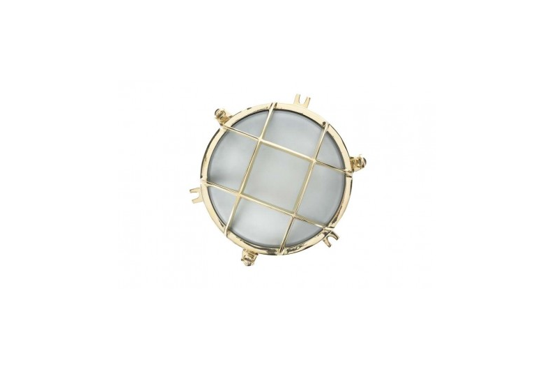 Reproduction of a marine lamp used to illuminate the corridors between cabins or equipment of a ship allowing better people movement. It can be fixed on wall or desktop, it runs on electricity and manufactured with brass and frosted glass and protected by a grid and fixed by wing nuts. Indoor use.