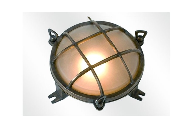 Reproduction of a nautical lamp used to illuminate the way through the booths or the equipment of a ship allowing better circulation. Apply electrical mural in antique brass with frosted glass and protected by a grid fixed by wing nuts. Indoor use.