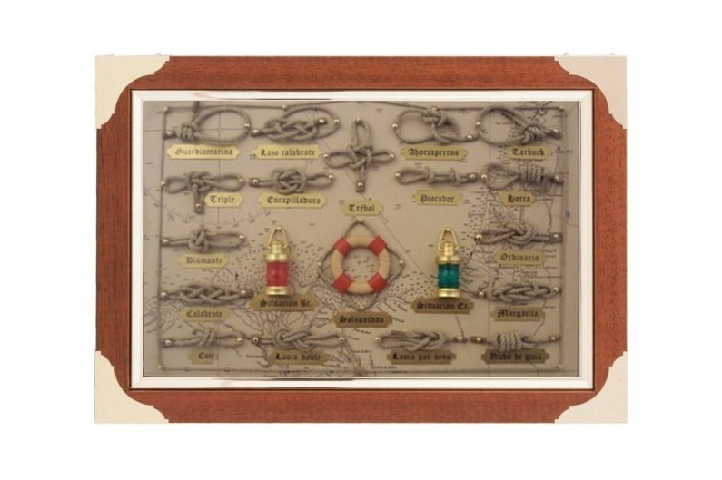 Beautiful decorative picture of marine knots and ropes, with numerous nautical items. Wood frame made and glass protected. The used rope is cotton. Each knot has a plaque with its name engraved.