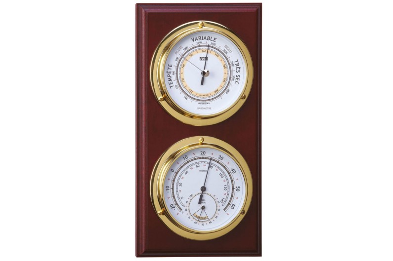 Small instrument for real measurement of temperature, pressure and humidity. Made of polished and lacquered brass, golden colour, on a red wooden base.