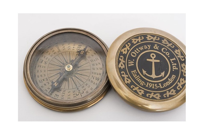 Brújula dorada envejecida con estuche de cuero. História de la brújula