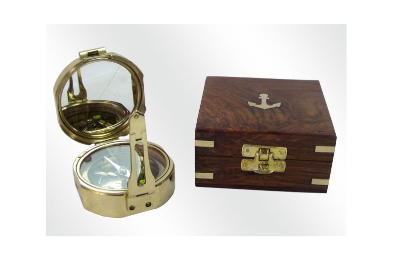 Preciosa réplica de una brújula de barco Brunton, fabricada en latón brillante. Incluye caja de madera forrada en el interior, con inscripción de ancla. El diametro de la brújula es de 8cm. Funciona perfectamente aunque su uso debe ser exclusivamente decorativo. História de la brújula de barco