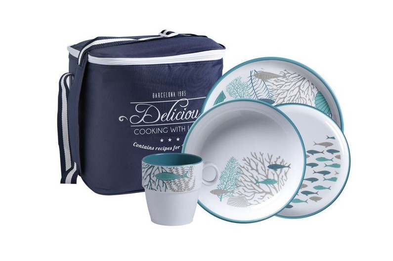 Set de 24 piezas, que incluye: 6 platos planos, 6 platos hondos, 6 platos de postre, 6 tazas mug y bolsa de transporte.