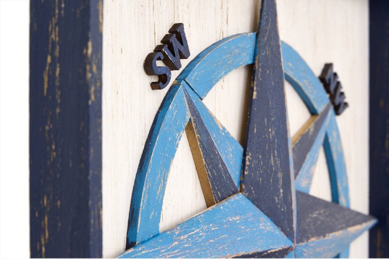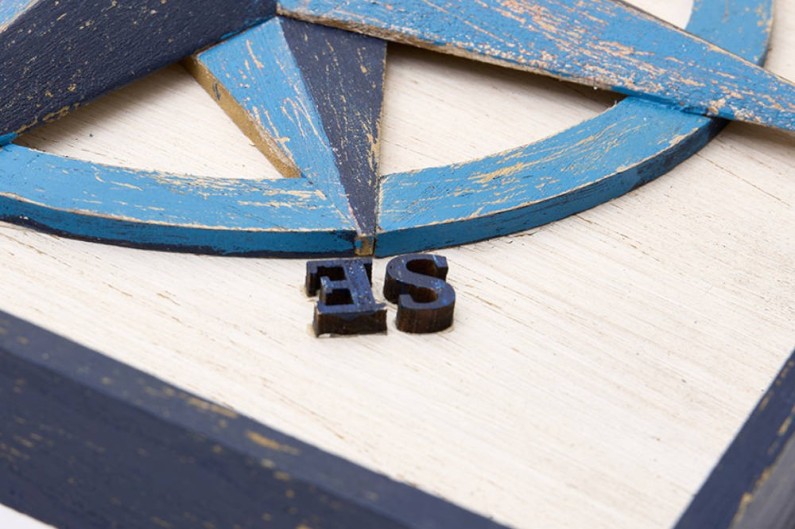 Cuadro marino decorativo en madera. En el cuadro destaca una preciosa rosa de los vientos.