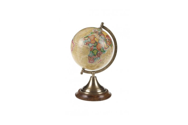 Globo terráqueo sujetado por un pie de latón y madera.