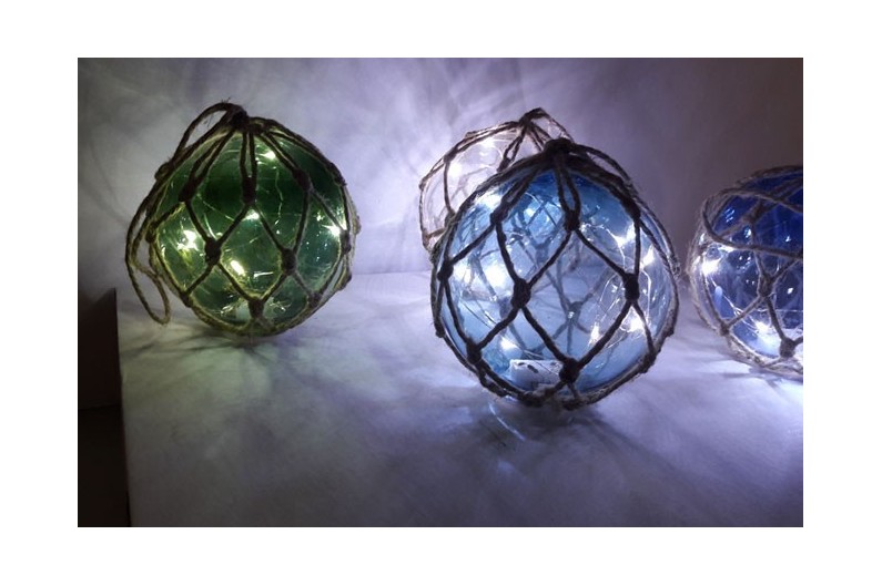 Set de 4 boyas de pesca con led de diferentes colores. La boya de pesca era un antiguo flotador constituido de una bola de vidrio envuelta de una cuerda trenzada. Se utilizó hasta los años 50. Estos flotadores se fijaban en las redes de pesca para que se mantuvieran en la superficie mientras derivaban por la corriente.
