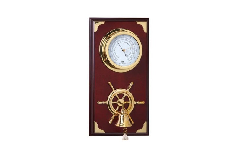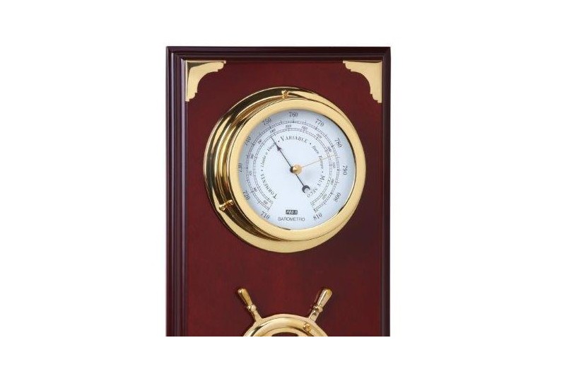 Barómetro. Indica la presión atmosférica. El instrumento de medición es metálico. Está montado sobre una base de madera. Uso preferente interior.
